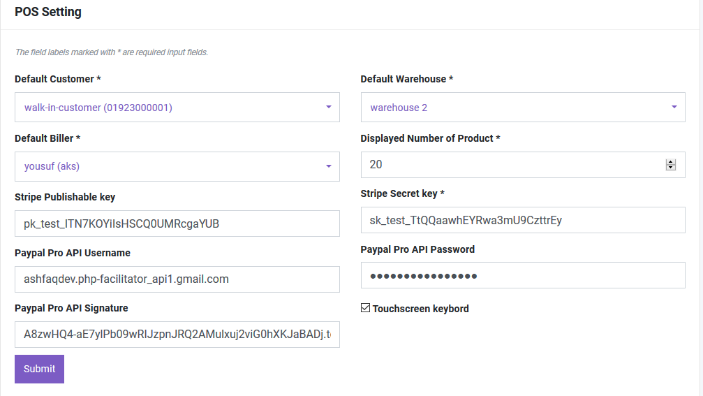 يمكنك ضبط إعدادات نقاط البيع الخاصة بك. يمكنك تحديد العميل الافتراضي، البائع، المستودع وعدد المنتجات المميزة التي ستظهر في وحدة نقاط البيع. يجب إدخال مفاتيح Stripe لتفعيل الدفع بالبطاقة، ولتفعيل الدفع عبر Paypal يجب شراء API مباشرة من Paypal.