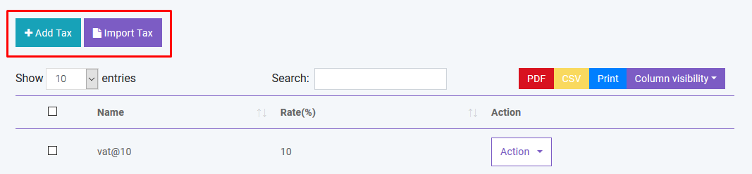 يمكنك إنشاء وتحرير وحذف أنواع الضرائب المختلفة للمنتجات. يمكنك أيضًا استيراد الضرائب من ملف CSV. يجب اتباع التعليمات بدقة عند الاستيراد.