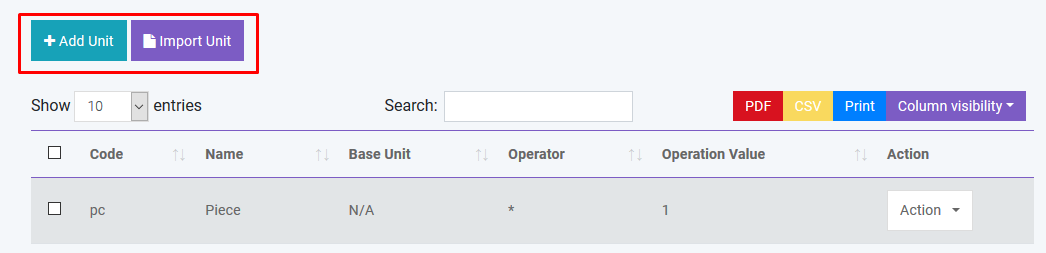 يمكنك إنشاء وتحرير وحذف وحدات المنتجات. يمكنك أيضًا استيراد الوحدات من ملف CSV. يجب اتباع التعليمات بدقة عند الاستيراد.