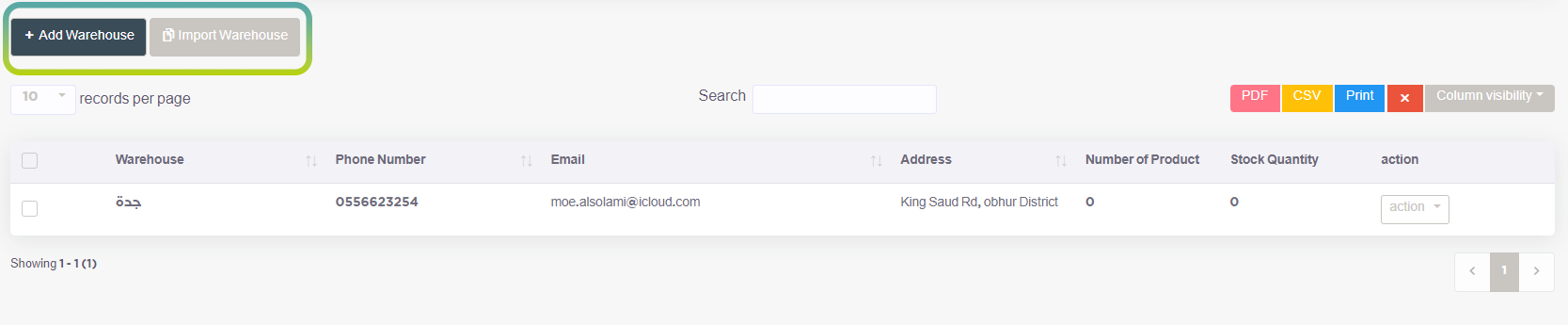 يمكنك إنشاء وتحرير وحذف المستودعات. يمكنك أيضًا استيراد المستودعات من ملف CSV. يجب اتباع التعليمات بدقة عند الاستيراد.