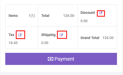 لإضافة الخصم، الضريبة أو تكلفة الشحن، اضغط على الأزرار الموضحة أدناه. لإنهاء عملية البيع، اضغط على زر الدفع (Payment).