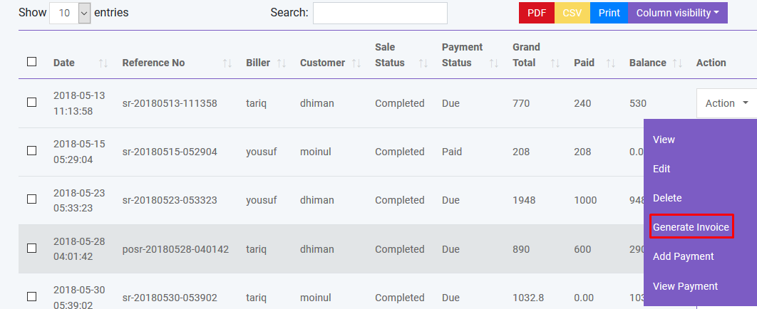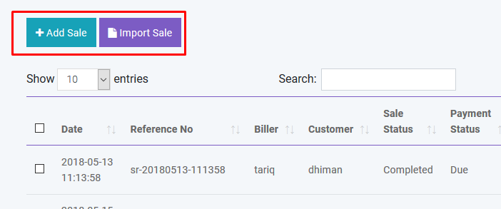 كما يمكنك البحث، التصدير والطباعة من جدول المبيعات تمامًا كما شرحنا في قسم المنتجات (Product).